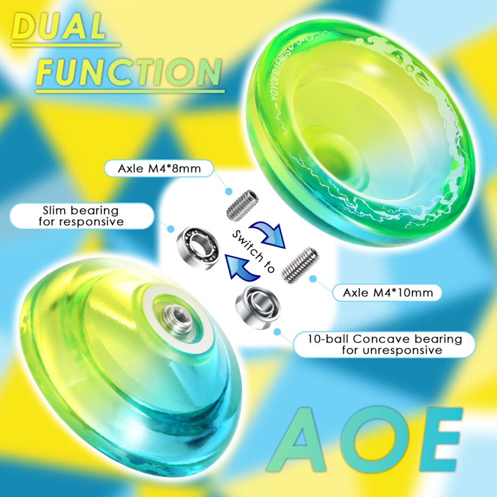 WHAT YOU GET – 1 x Responsive yoyo AOE (Blue Yellow), 1 x Concave bearing (for unresponsive yoyo mode), 10 x Yoyo strings, 1 x Storage Case, 1 x Axle (M4*10mm), 1 x bearing removal tool, 1 x small allen key.